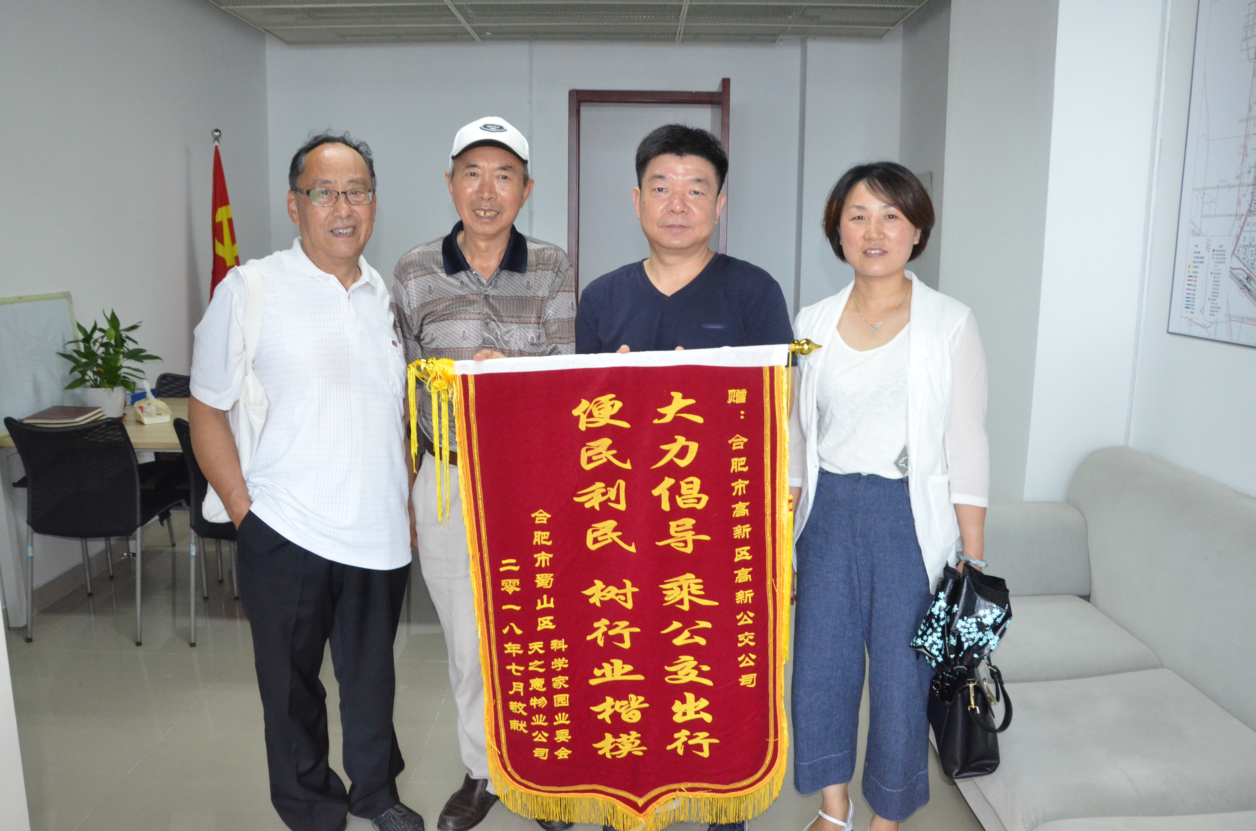 8月7日上午,科學(xué)家園居民陸老先生協(xié)同天之意物業(yè)公司領(lǐng)導將一面印有“大力倡導 乘公交出行,便民利民 樹(shù)行業(yè)楷?!钡腻\旗送至高新公交公司,為感謝高新公交公司優(yōu)化657線(xiàn)路為科學(xué)家園小區居民出行提供便利。