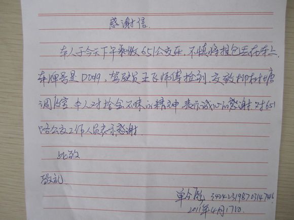 近日,高新公交公司收到了一封來(lái)自乘客單某的感謝信,來(lái)信講述了駕駛員王飛同志在駕駛車(chē)牌號D0019的公交車(chē)上拾金不昧的事跡,并希望通過(guò)對王飛同志拾金不昧的高尚行為,表示深深的敬意和誠摯的感謝。