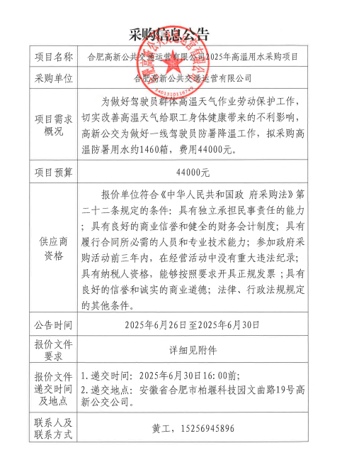 合肥高新公共交通運營(yíng)有限公司2025年高溫用水采購信息公告