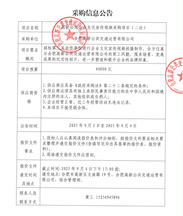 高新公交企業(yè)文化宣傳視頻項目采購信息公告(二次)