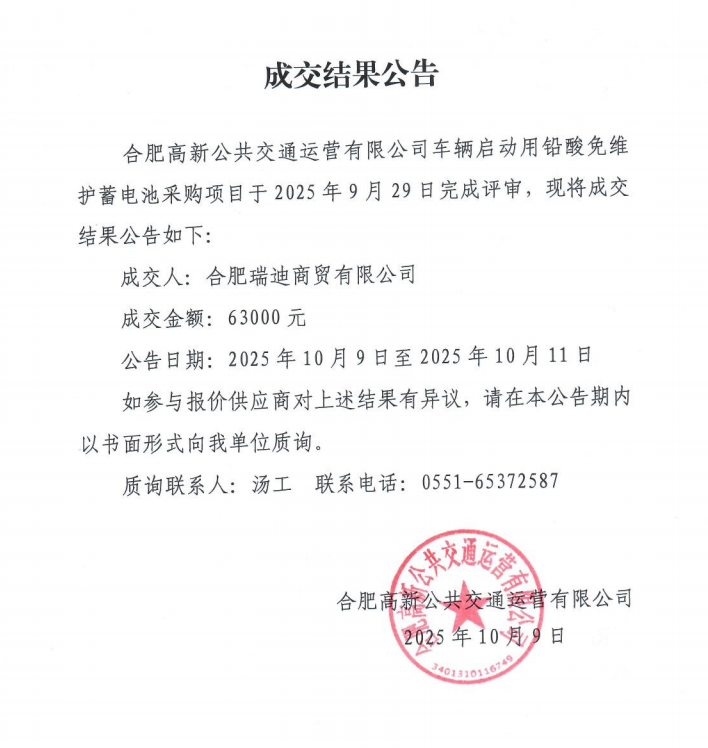 車(chē)輛啟動(dòng)用鉛酸免維護蓄電池采購成交結果公告