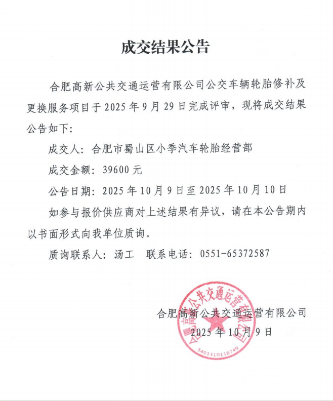 公交車(chē)輛輪胎修補及更換服務(wù)成交結果公告